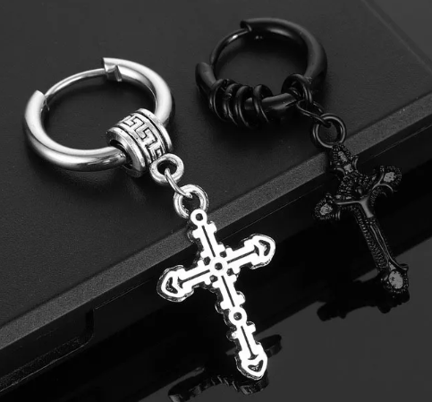 UNISEX SILVER CROSS HUGGIE HOOP WATER DROP EARRING