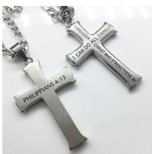MENS SILVER CROSS TITANIUM STEEL BIBLE SCRIPTURE PENDANT NECKLACE